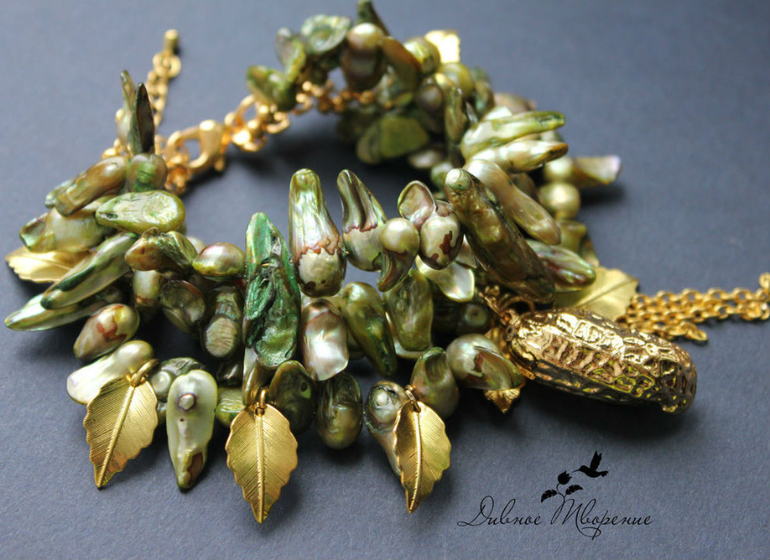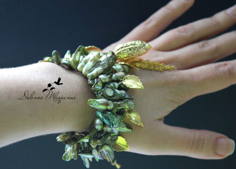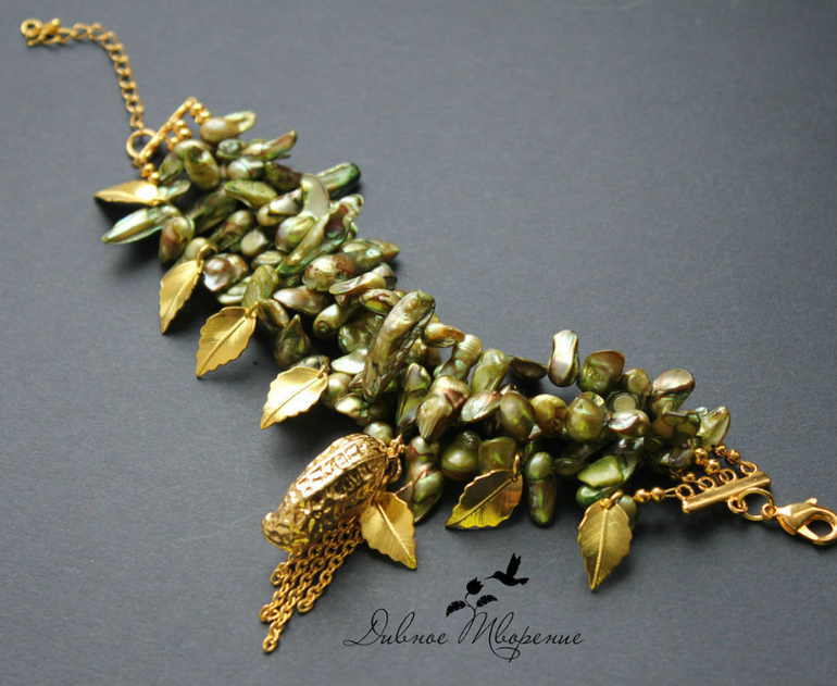 Браслет "Орешник", из невероятно красивого зеленого жемчуга.Вся фурнитура качественная позолота.