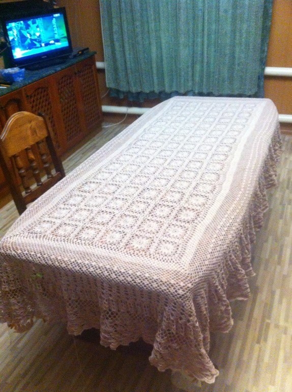 Если нужный стол под рукой, то можно постирать и прямо на нем высушить. Или разложить где-нибудь, если есть возможность. Скатерть — большая вещь, за время вязки может испачкаться. Можно немного накрахмалить, если ходите.