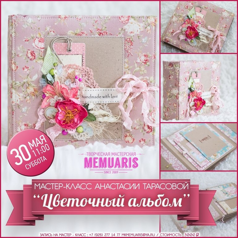 На занятии мы создадим с нуля красивый цветочный альбом формата 20х20 см, сложный по конструкции, с большим количеством раскладных элементов, потайных страничек и любимых вами «секретиков». Тематика альбома свободная, он может быть про любовь, семью или про лето. Обложка из ткани, хитрый крафтовый переплет, множество цветов, вязаных и натуральных декоративных элементов. Вы получите огромное удовольствие от создания этого уютного, нежного и милого альбома.