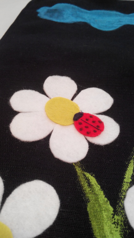 Цветы и лягушка и прочая живность, фетр. Трава и облака краска для ткани. Так как ткань не промокающая, очень сложно было рисовать и закреплять краски. Размазалось, но не беда в песочницу пойдет.