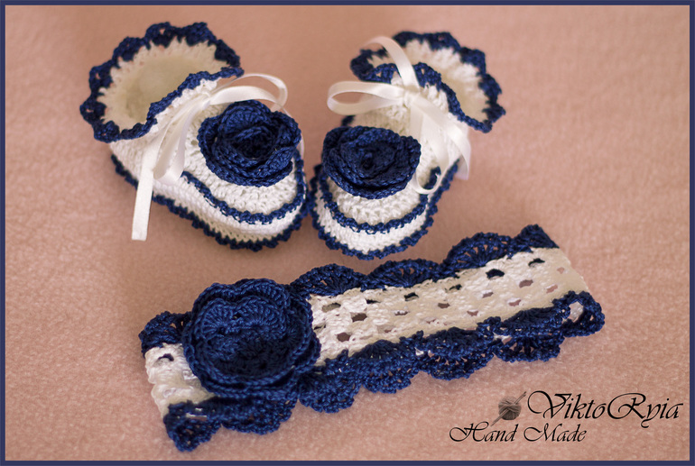 В дополнение к платью связала в подарок крошке вот такую повязку и пинетки. Так как посылка уже благополучно дошла, могу показать)