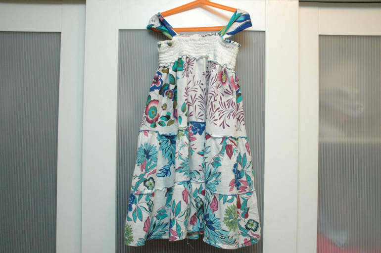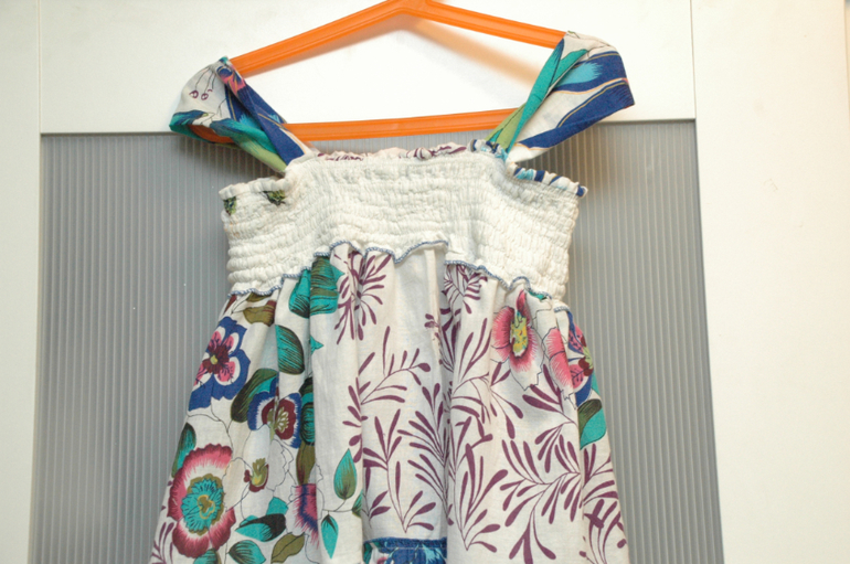 потому что по груди - резинка это фрабичное (было на сарафане, по талии шло), дальше я обрезала примерно метр, до начала принта, и сшила две детали. И Добавила бретельки из той же ткани - как сами видите, простое платье как 2 копейки.