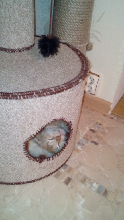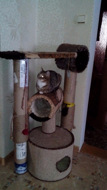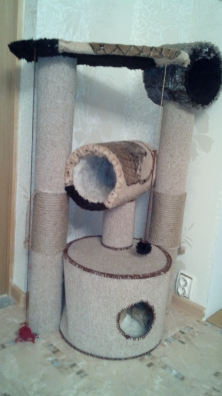 Я "кошатница", в доме у нас всегда кот, кошка и пара, тройка котят, вот решили и наше семейство порадовать домом, он им очень нравится, спят там, играются клубками. Это Макс отдыхает после 2 недель без сна и отдыха, весна на дворе. Только незнаю в какую категорию отнести, тут чуть дерева, картона, шитья