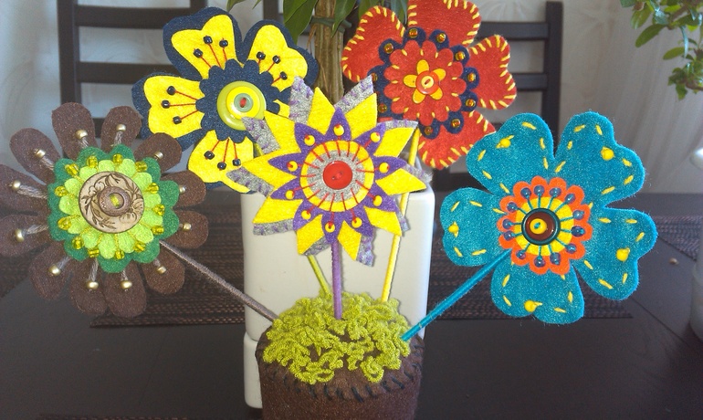 ФетрМы сейчас в гостях у бабушки и увидела у нее цветочки, кот я ей делала лет 5 назад. Это наверное было самое самое первое, что я сделала из фетра. Я тогда еще не была таким хомяком, как сейчас. И у меня были только тысячные запасы всевозможного бисера и только один набор фетра (хоть и из 82 цветов ) :)))))) В общем на тот момент мне эти цветочки казались ну просто идеальными. Сейчас уже смотрю на них и задаюсь вопросом.. А где же листочки, что это за смешная травка в горшке, где объем у цветочков ... В общем моих личных придирок сейчас много. Но они мне дороги, т.к.были первыми. Поэтому милости прошу к просмотру :