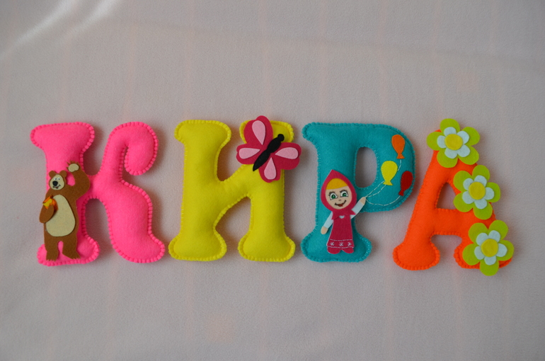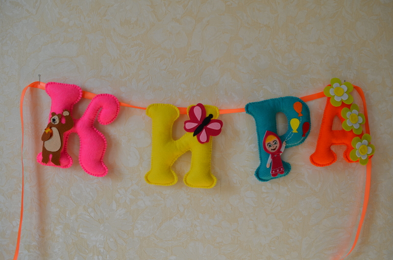 Декор, витражи.Для чудесной и очень шустрой девочки Киры, сшилась такая именная гирлянда с любимыми героями мультика. Растяжка получилась такой же яркой и жизнерадостной, как и сама малышка!