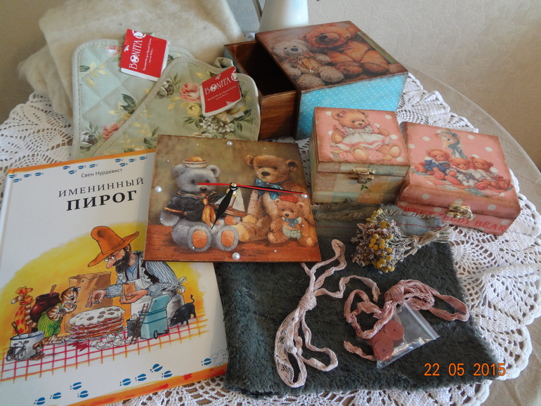 С нетерпением ждала посылку от ИнессыИнесса ,и вот сегодня мы ее получили!!!! Обменивались мы на декупажные вещицы,а получили кроме них и замечательные подарки,мой хомяк пищал от восторга от набора для создания тедди(вискоза-итальянская,цвет такой необычный,шплинты,диски,кружева,шерстепон)- просто супер!!!!! Мне прихваточки,очень красивые!!! Книга для детей очень интересная,у нас подобных еще нет,с интересом рассматривали картинки.Шоколадки не дожили до фото....было очень вкусно,спасибо!!! Ульяна облюбовала маленькие шкатулки,уже положила туда свои киндеры,а часики Тихону понравились!!! А мне все!!!! Теперь разложу милые вещицы в шкатулочки,ух как я люблю это дело!!!! Спасибо огромное Инесса,была очень рада обмену с тобой!!!! А дальше фото кому интересно))))