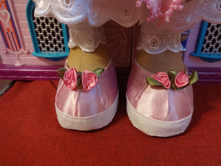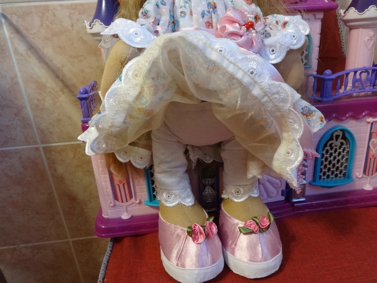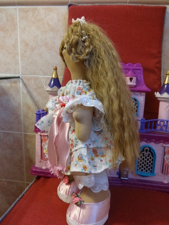 У меня опять пополнение в игрушечном семействе. Вот такая получилась принцесса. Высотой около 40 см, стоит сама, сидит с опорой. Сшита из кукольного трикотажа, волосы - трессы, платье - хлопок, туфельки из атласной ленты. Корона - из бусин. Трессы использовала впервые, не уверена, что сделала все правильно, но, вроде, ничего не испортила. Буду рада отзывам, критике, советам. Под срезом много фото.