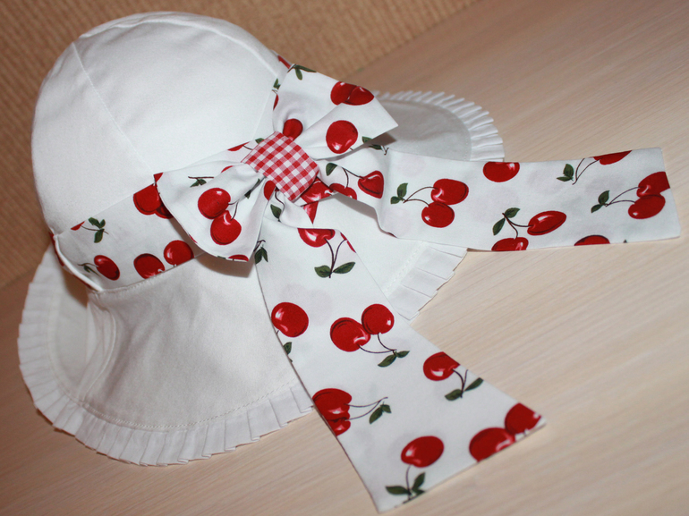 Основа юбки - трапеция, на нее нашиты оборки из шитья, хлопка корейского и турецкого, кокетка из рибаны. В комплекте - повязка с бантиком + панама со съемным бантом на липучке.