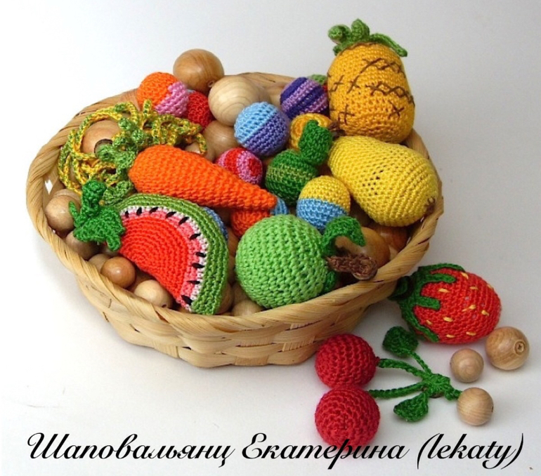 Бусы на длинных завязках ( общая длина, ввиде растяжки 123 см, бусинная часть 55 см, фрукты-овощи от 3,5 см -яблочко до 6 см-морковка) что позволяет регулировать их длину, а так же использовать в качестве растяжки-погремушки в коляску, кроватку или автокресло. Сами игрушки так же с легкостью можно использовать, как дополнительные к развивающему коврику или подобным аксессуарам, погремушек и даже прорезывателей. А когда малыш подрастет, у него будет прекрасный набор овощей, фруктов и ягод для ролевых и развивающих игр.