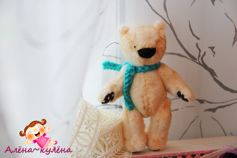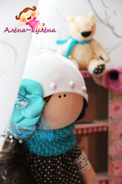 Покажу Вам мою новую девочку, зовут Илона, рост 30 см, одета в кофейно-бирюзовых тонах (давно влюбилась в это сочетание...) в руках держит мишку - это тоже так сказать мой дебют...впервые шила такого кроху по выкройке мишек тедди..правда малыш - упрощенная их версия...сшит из плюша, набит синтепоном, не утяжелен...тонирован масляными красками...ручки-ножки на нитевом креплении..рост 11 см
