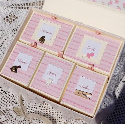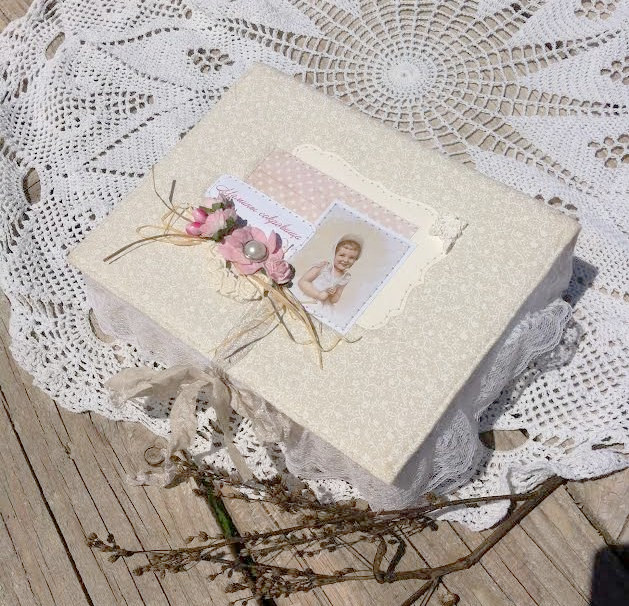 для девочки, на 5 ячеек - носочки, соска, бирочка, локон, зубик. Обита хлопком нежного молочного оттенка, торец обит кружевом, внутри именная табличка для записи данных дочки.