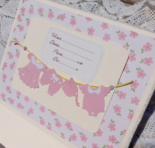 Скрапбукингдля девочки, на 5 ячеек - носочки, соска, бирочка, локон, зубик. Обита хлопком нежного молочного оттенка, торец обит кружевом, внутри именная табличка для записи данных дочки.