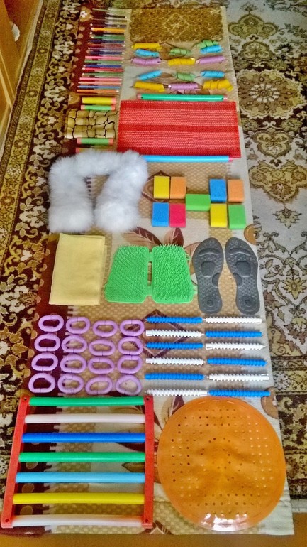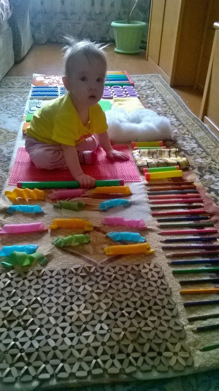 Всем привет!))) Насмотрелась на этом замечательном сайте различные работы по созданию развивающих массажных ковриков и дорожек и решила сотворить что-то подобное для своей доченьки! Нам год и месяц, самостоятельно еще не ходит, но первые шаги, чувствую, не за горами!!! Абсолютно все детали для коврика нашлись дома, не потратила ни копейки!))) Сделала я его за 5 часов. За основу взяла резиновую дорожку для ванны, обшила ее пледом, который без дела лежал в кладовке. Итак, для массажного коврика мне понадобились :