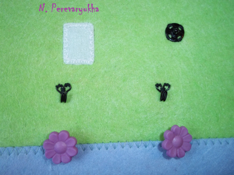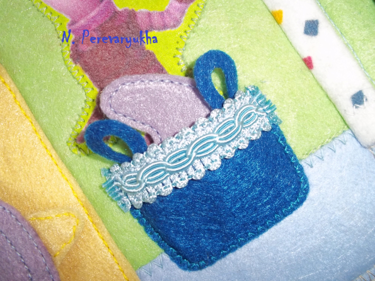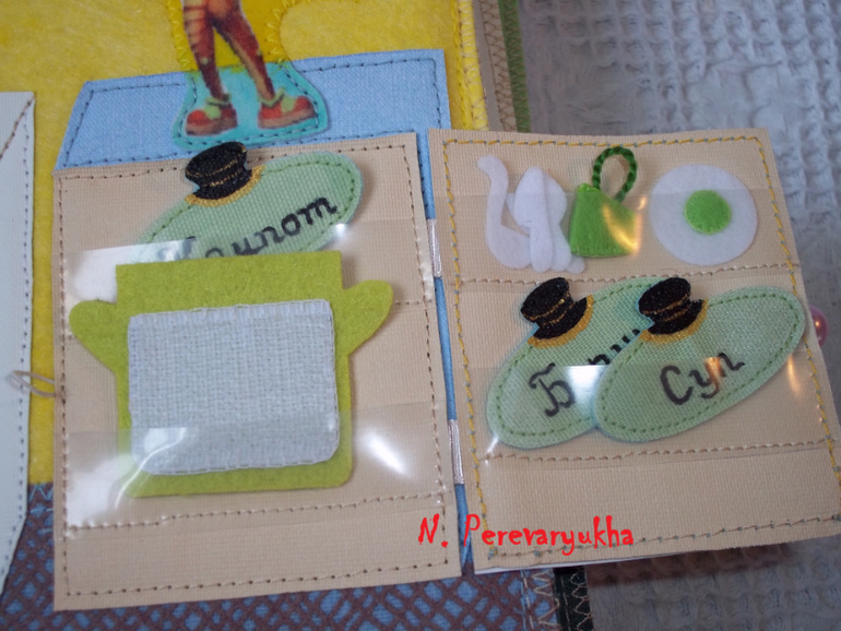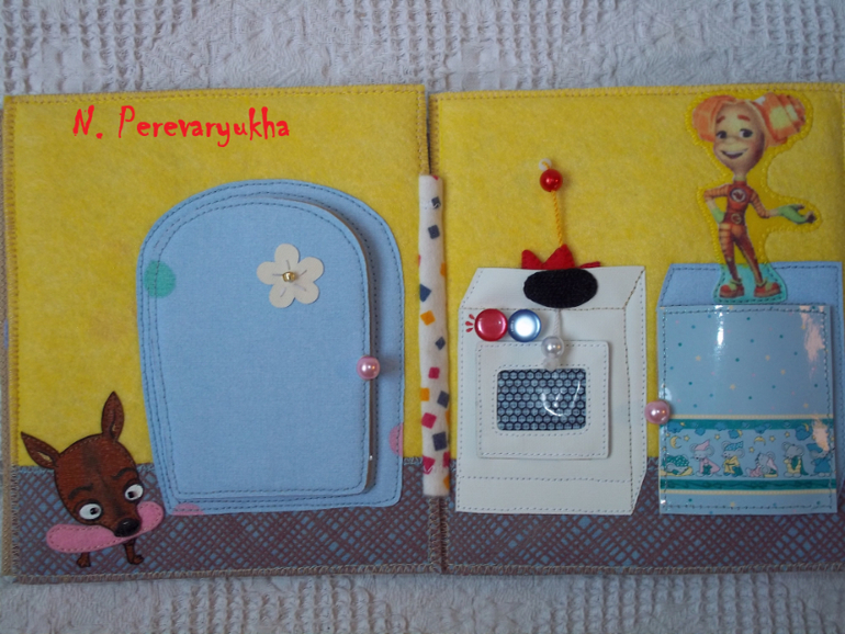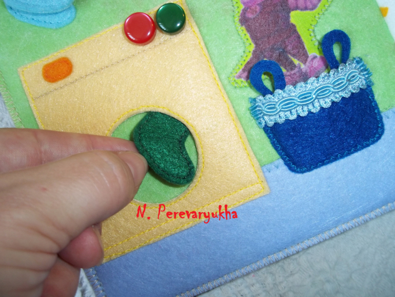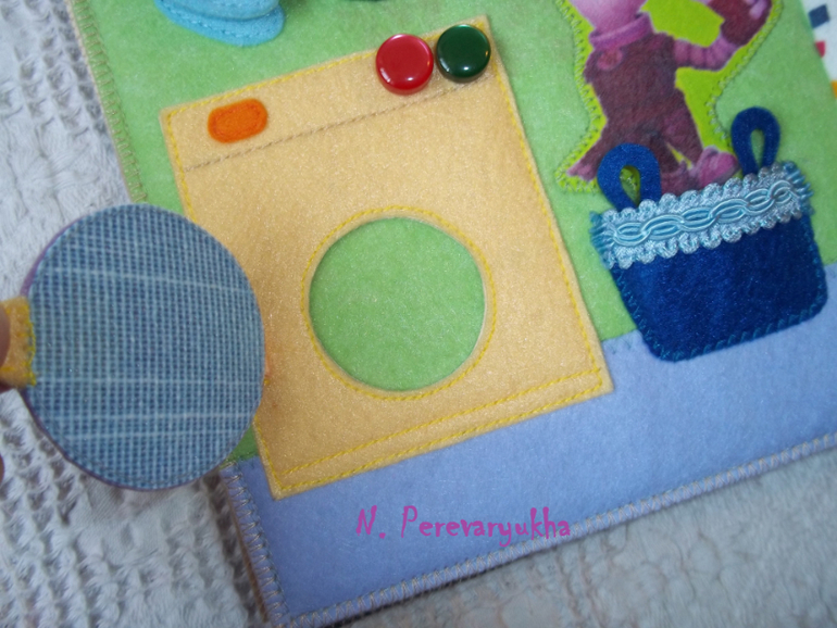 Последний разворот- стиральная машинка, в которой можно стирать белье, сверху на веревке можно рассортировать носки. На корзине стоит Мася и контролирует процесс (Мася- взрослый фиксик розового цвета, мама Симки с Ноликом и супруга Папуса. Всё время наводит чистоту и порядок, не терпит хаоса и бардака.)