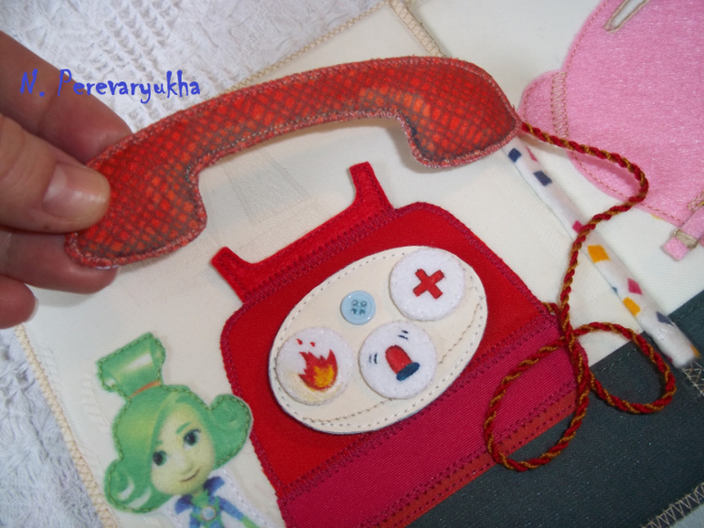 Разворот третий- стол с телефоном и копилкой. Диск телефона крепится с помощью кнопки, можно набрать телефоны экстренных служб, на помощь приходит Верта (фиксик зелёного цвета. Ещё одна одноклассница Симки и первая красавица в классе. В неё влюблены все мальчики-фиксики)