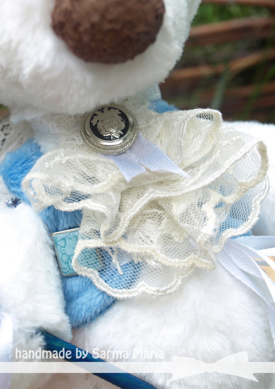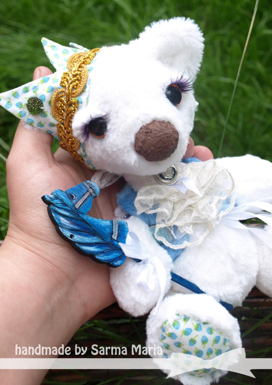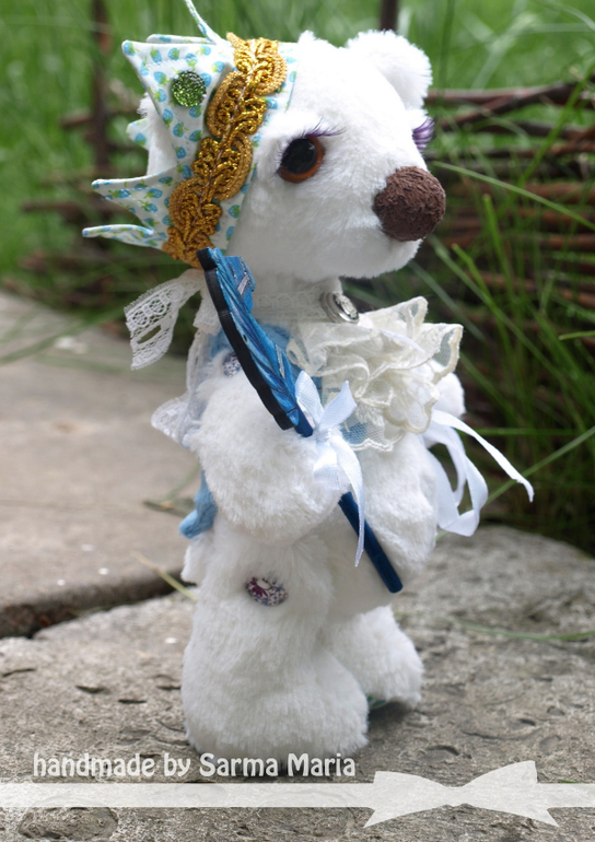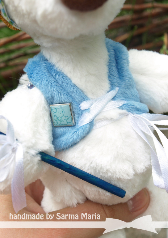 Пошит из мягонького искусственного меха. Одет в плюшевую жилетку. На голове корона из хлопка с клубничками)