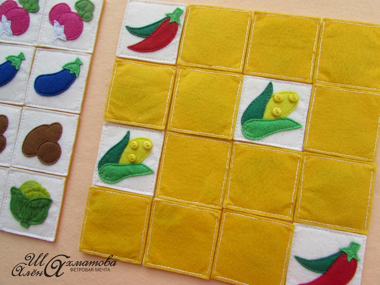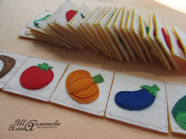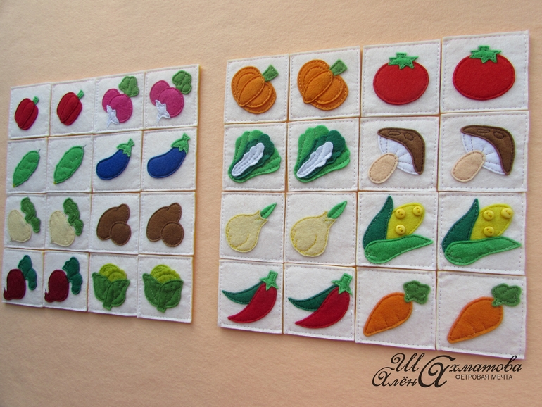 Карточки размером 5х5 см, из жесткого фетра с аппликацией. Всего 32 карточки по две штуки каждого вида. Сшито полностью вручную. (Ребенок успел поиграть до того, как я сфотографировала, поэтому карточки немного помяты)