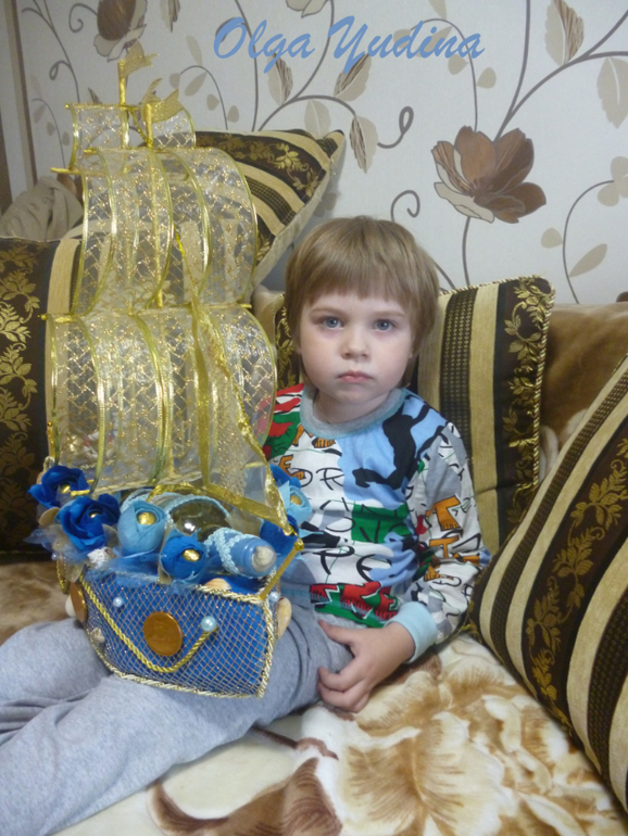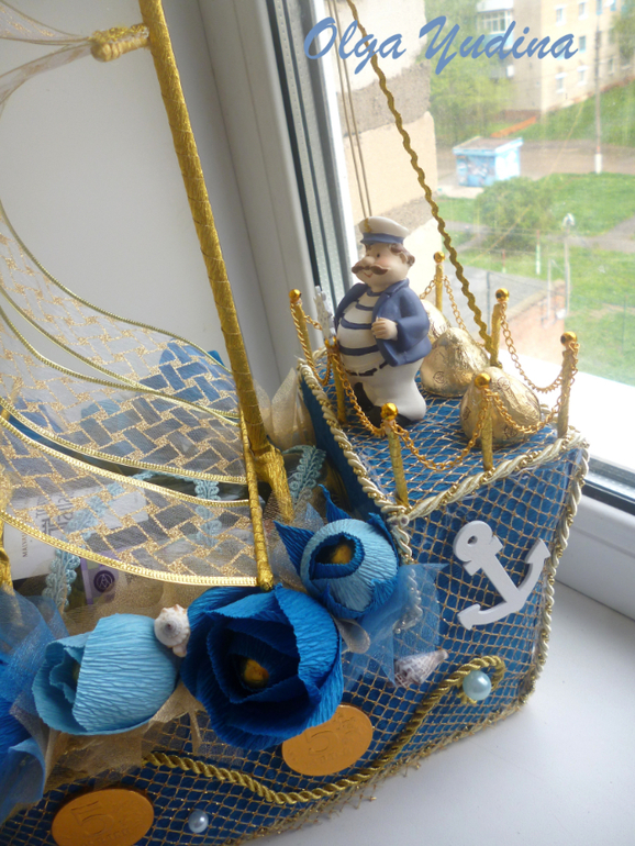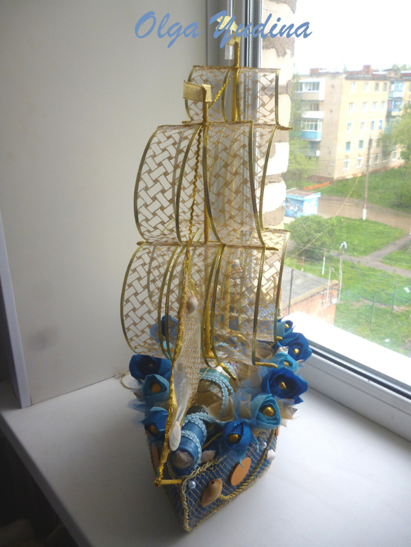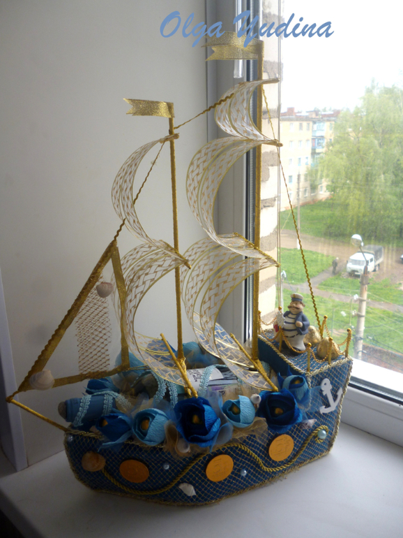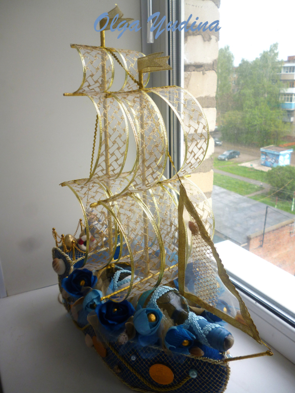 И корабль для молодого человека с бутылкой вина и моим помощником для масштаба.мой 3-ий корабль,всё в том же синем цвете,огрехи на лицо,конечно,но лучше пока не получается: