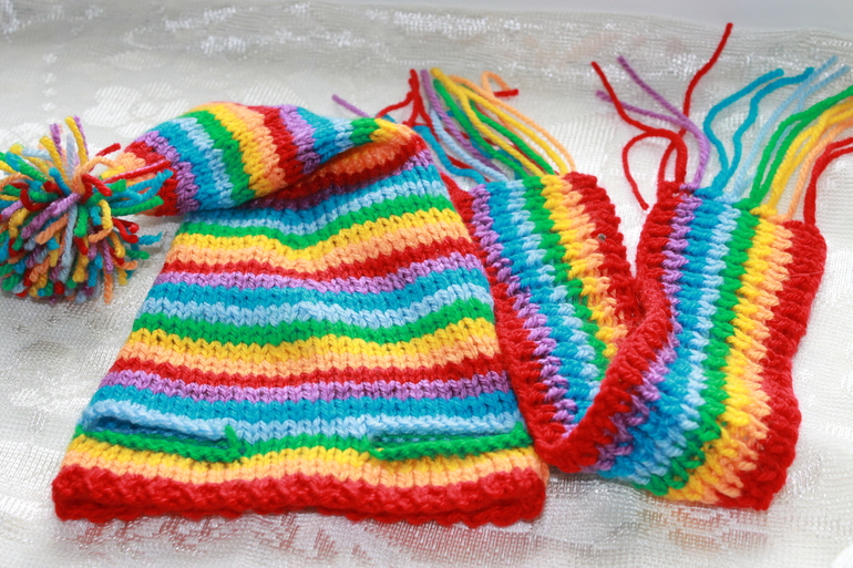 сам серенький (вернее стального цвета), мордочка, животик и носочки светло-серого цвета. Он очень любит яркие цвета, поэтому у него есть радужные шапочка и шарфик