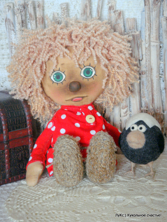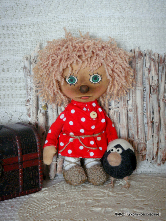 Домовенок 30см ростом, сшит из тонированной бязи, хлопка, трикотажа и пряжи. Личико расписано акриллом и маслом, лапти из джутового шпагата. Вороненок 10см, свалян из шерсти)