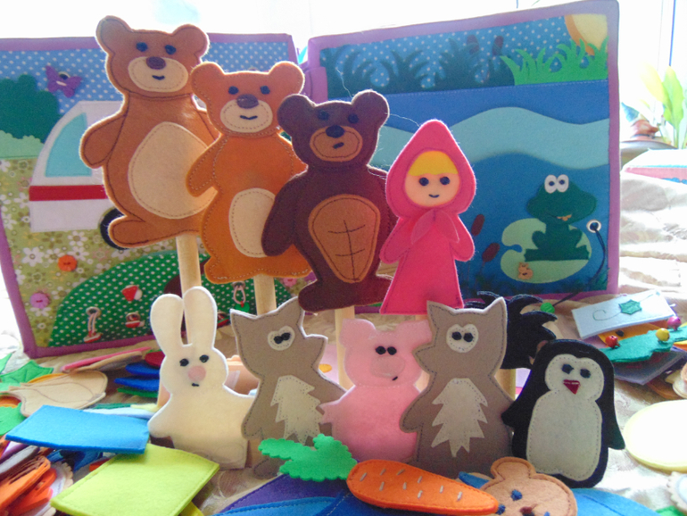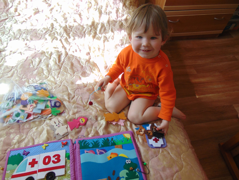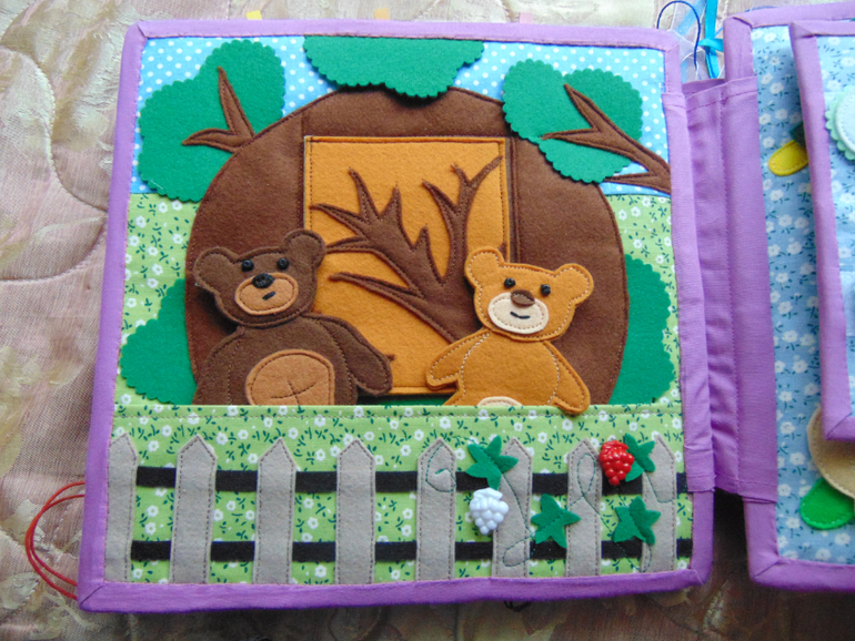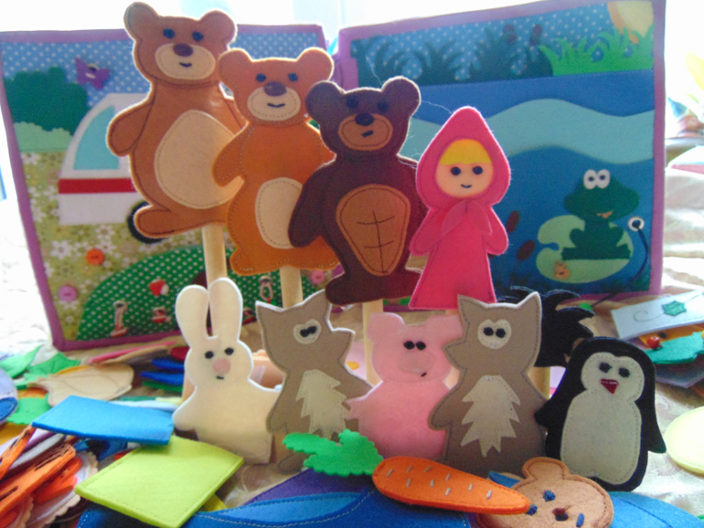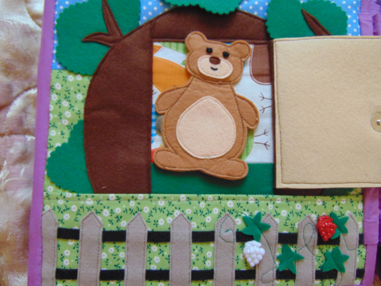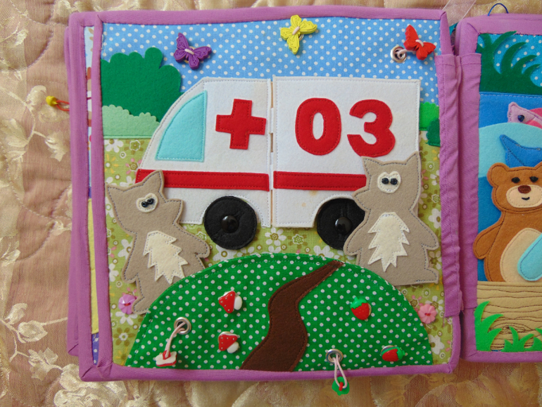 У машины снимаются колеса. В машине есть аптечка и кое какие медикаменты. Все для лечения больных... Есть пенек с тарелкой... Почти как в мультике. Рыбалка - любимое занятие медведя. Удочка и рыбки магнитные. Есть и обычные рыбки, и старый ботинок, и золотая рыбка... (кое что не сфотографировано, так как сшила чуть позже).