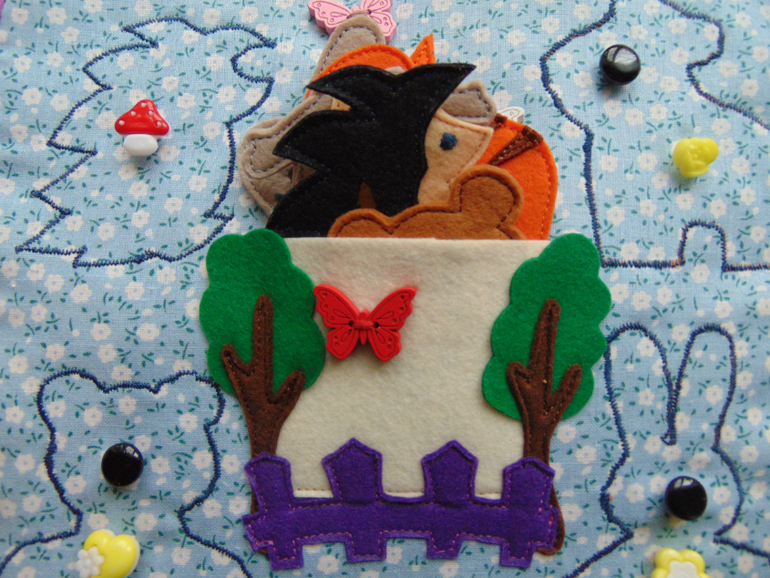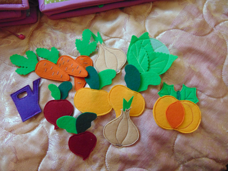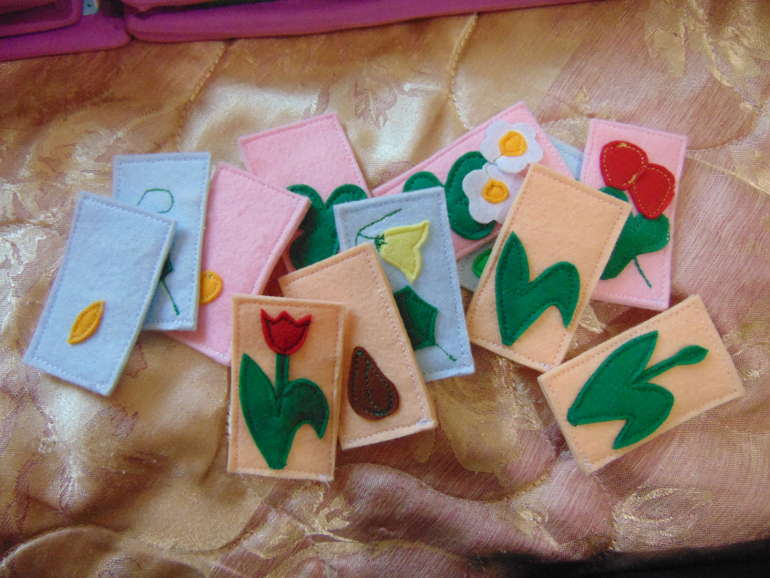 Далее "огородный" разворот. На одной страничке огород с различными овощами. (овощи планирую сшить еще). Зайка ворует морковку (как в мультике). На второй - задание. Нужно разложить карточки в последовательности роста (от семечка и до конечного результата). Выращиваем цветок (цветок из мультика) , клубнику и огурец.
