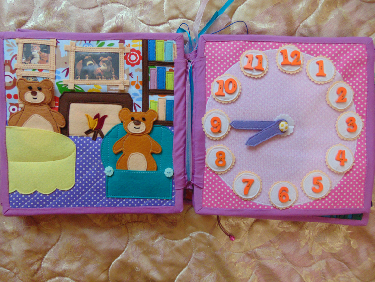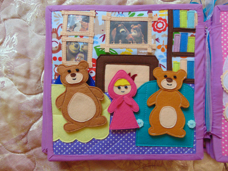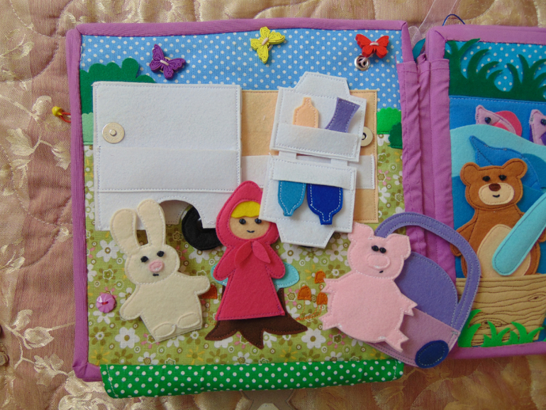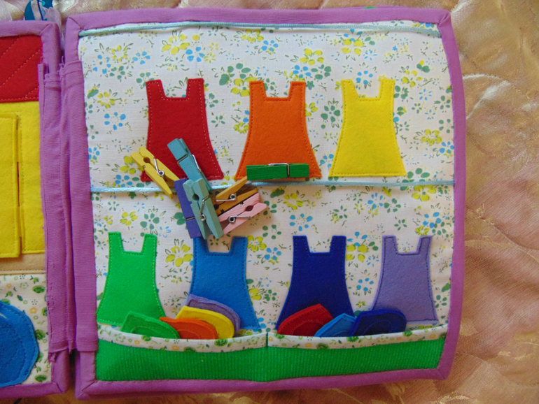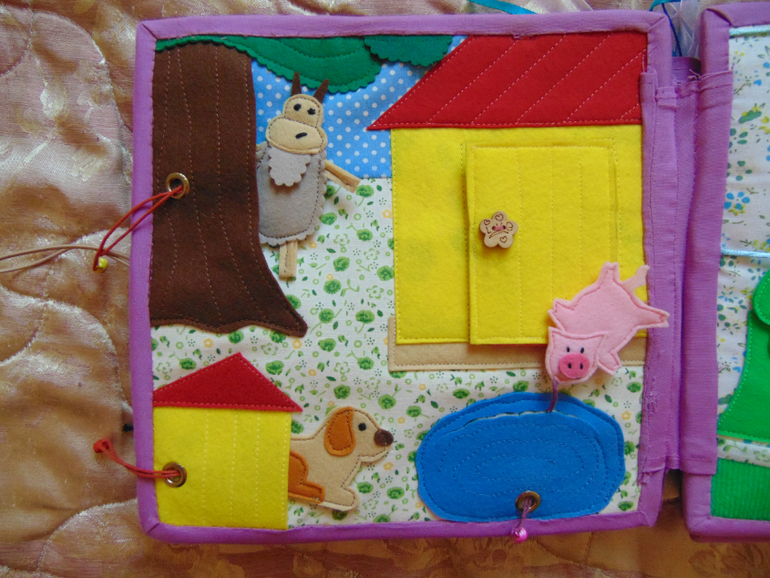 Первый разворот - дом Маши и ее наряды. При появлении Маши свинья, собака и козлик прячутся (как и в мультфильме). Ведро в котором Маша появляется то же есть, но оно не сфоткано. К платьям подбираем нужную косынку (изучаем цвета) прицепляем прищепкой (тренируем ручки).