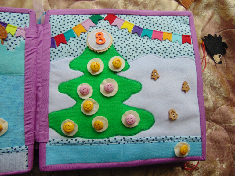 Наряжаем елку. Можно игрушками с предыдущих разворотов, можно определенным количеством игрушек. Вариантов очень много.