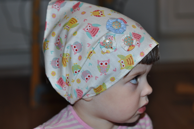 Сшила дочке косынку на лето, украсила йо-йошками (прикольные штучки). Ей очень понравилось, не снимает, так как наряжаться она любит)))