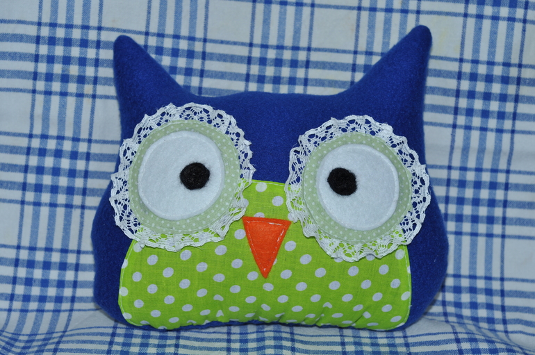 Знакомая просила сшить игрушечно-интерьерную сову. Вот что вышло у меня: сова флисовая с использованием хлопка и фетра, размер небольшой подушечки.