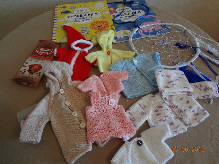 Сегодня мы получили посылку отelena . Обменивались мы на вязанную одежку для мишек,а получили еще и подарочки))).Наряды для мишек-они такие все хорошенькие,аккуратно связанны,подарочки для деток,сладости мы уже по дороге скушали,рисовалки очень понравились,такие интересные.Еще как правильно называется не знаю,ловец снов или что это? Спасибо большое Леночка за обмен,все очень понравилось)))