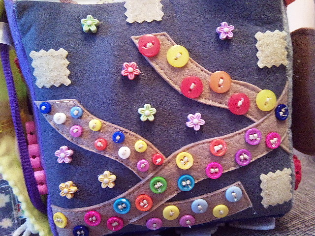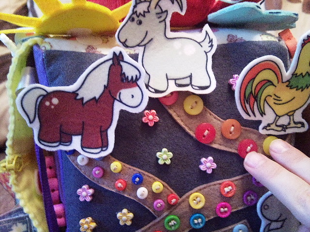 Сторона "Дорожки". Ребенок учится "ходить" пальчиками. Домашних животных можно поменять местами. Можно изучать цвета по пуговицам и искать одинаковые пуговицы. Кроме этого, малыш учит понятия "большой-средний-маленький".