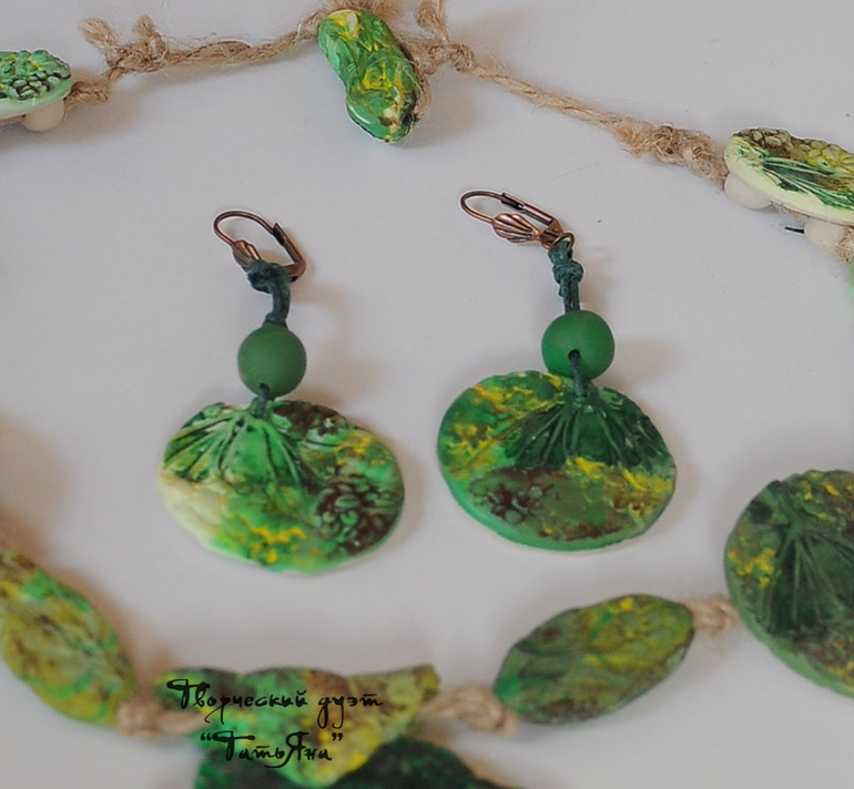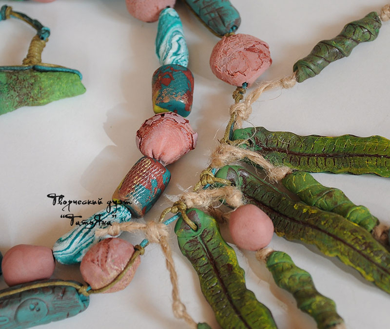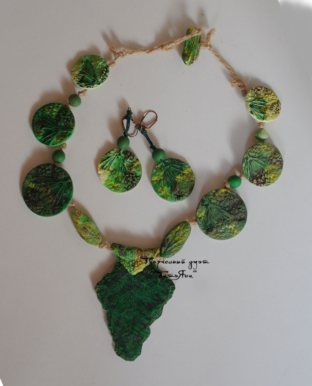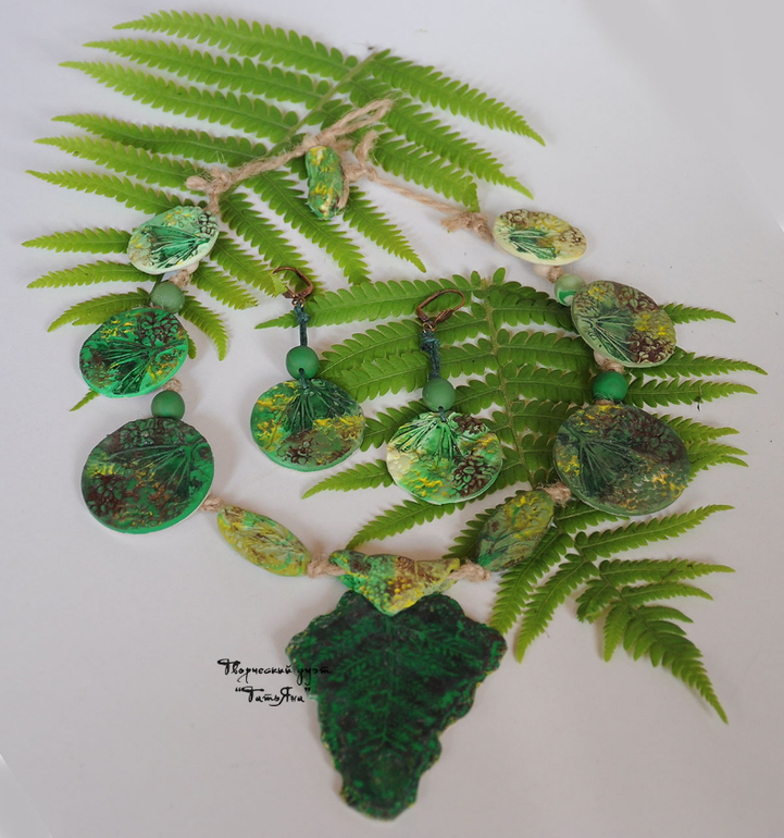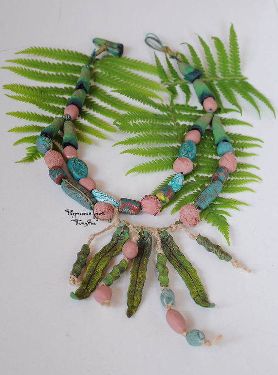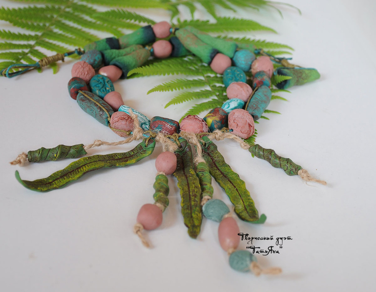 1. Длинные бусы с двойным рядом. Назвала "Лесная колдунья".Оттиски листьев папортника было началом этой все работе, а дальше просто лепилось, резалось, штамповалось, красилось, собиралось. Все на одном дыхании. Люблю когда так.