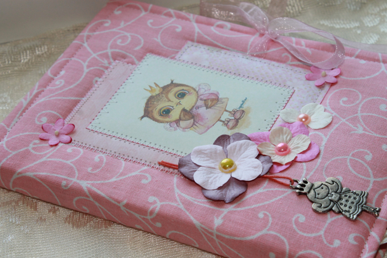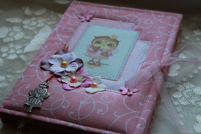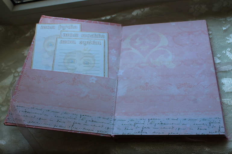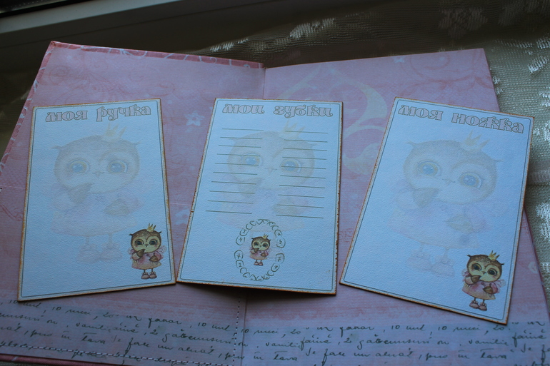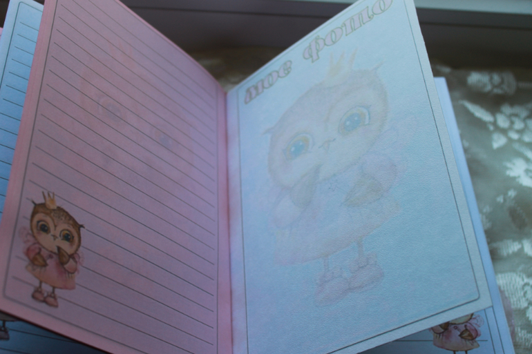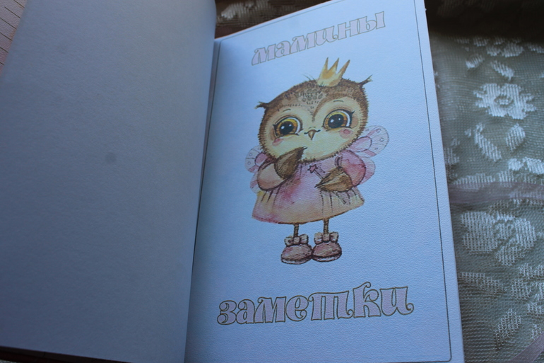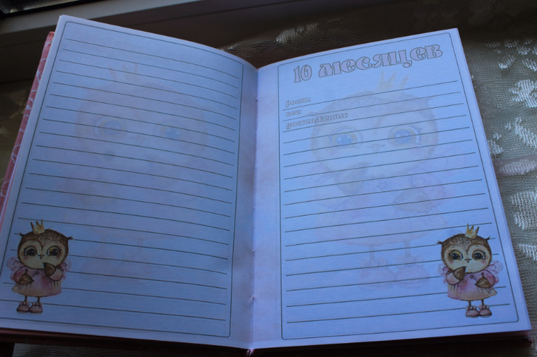 В блокноте 104 бело-розовые страницы с совушкой-принцессой, есть разделы Я родилась, Я расту, достижения по месяцам, детский словарик, маленькие шалости и мамины заметки, на форзаце кармашек для карточек - зубки, ручка, ножка. Формат А5