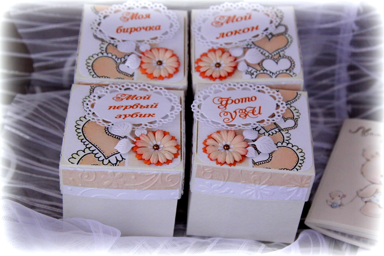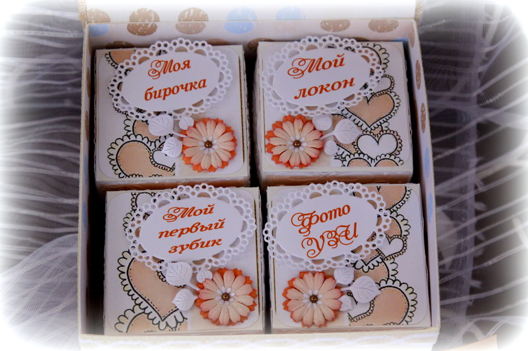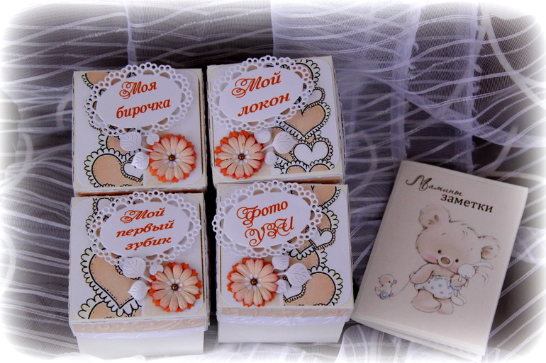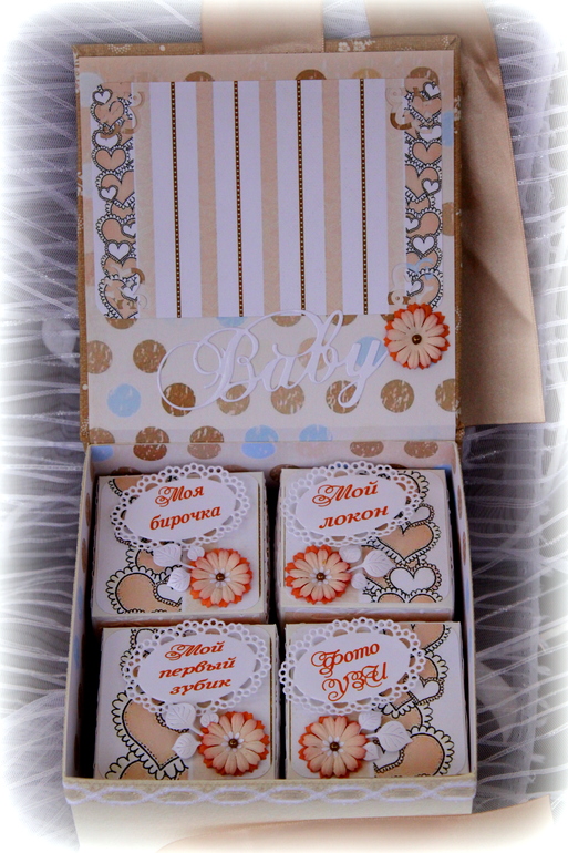 СкрапбукингБыли сделаны на заказ) Размер внутренних коробочек 7х7, мягкая тканевая крышка, так же в комплект входит мини блокнот для маминых заметок. Коробочку заказали для мальчика, но в бежевых тонах.