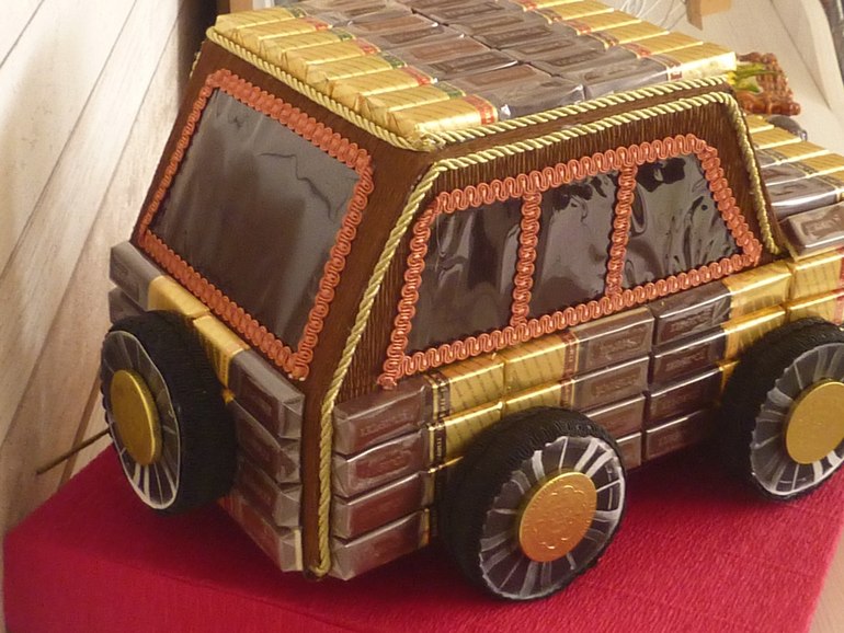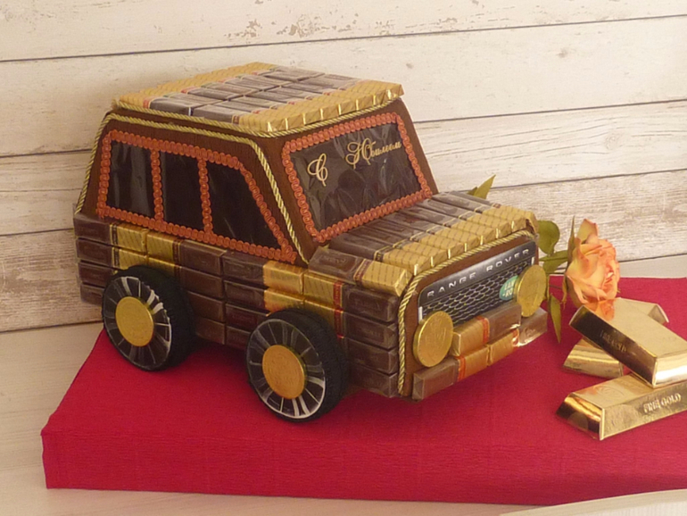 Делала джип из конфет, много недочетов, в следующий раз буду делать иначе. Далась она мне не легко.