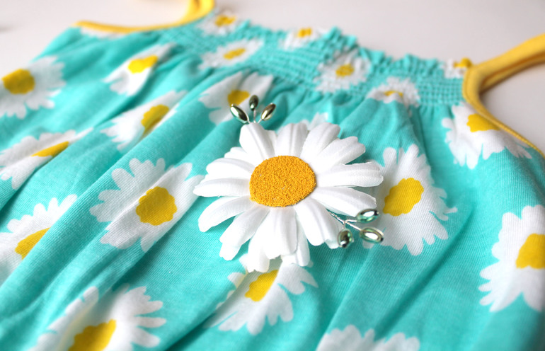 Ромашки задумывались для этого комбеза, но дочка не захотела его одевать. Нацепили с платьем, вот так: