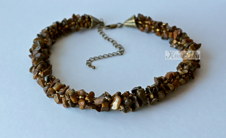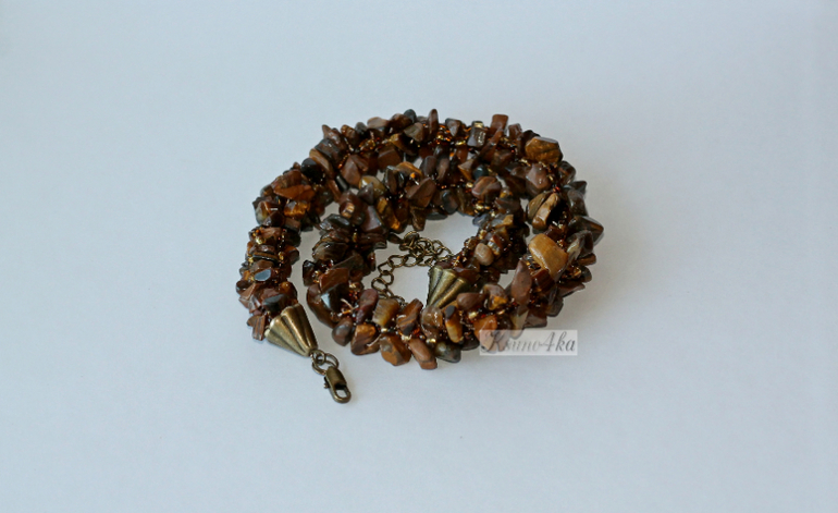Колье выполнено в технике "турецкий жгут" из сколов тигрового глаза, бисера, полиэстровой пряжи и фурнитуры под бронзу. Длина 42 см+удлинительная цепочка.