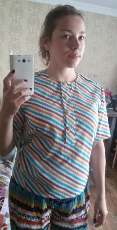 Ну и фото на мне (ужасного качества), не накрашена (из дома не выходила сегодня), такчто простите......Брюки планирую одевать однотонные льняные (белые). Фоткать некому совсем.