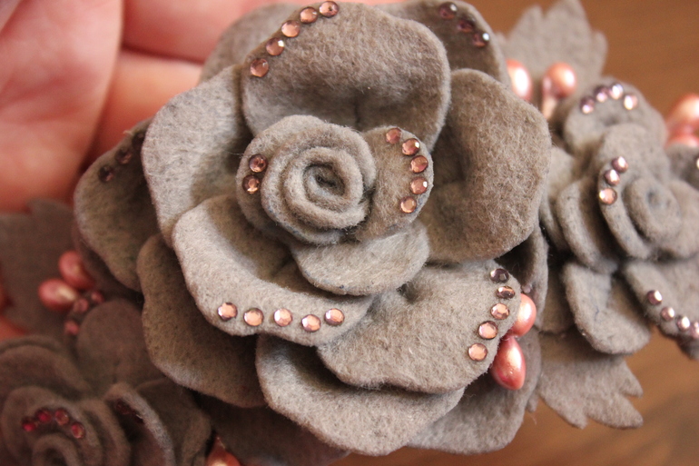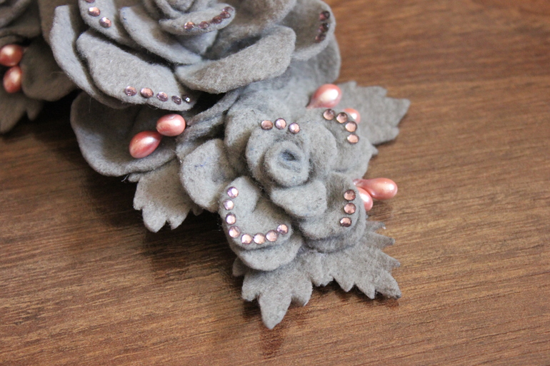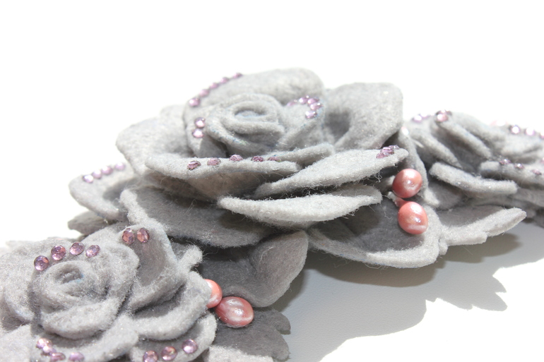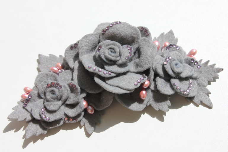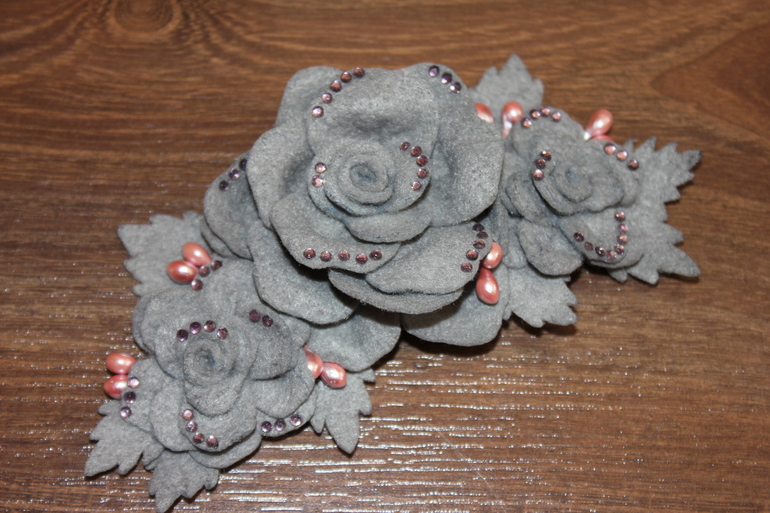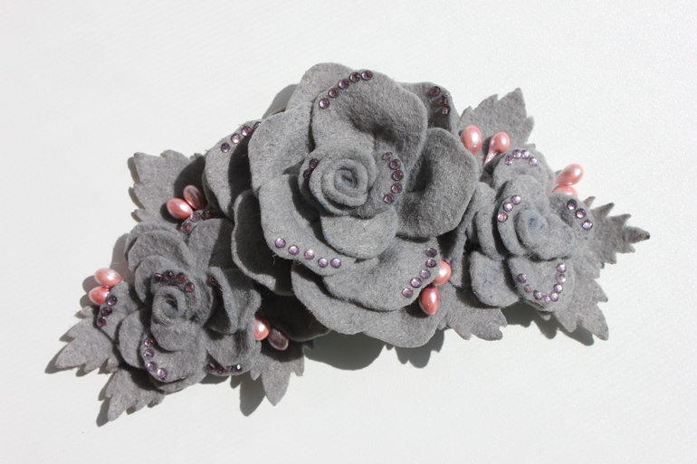 В этот раз получилась вот такая композиция из фетра серого цвета. Мне все больше и больше нравится делать цветы из фетра, в голове уже столько идей для ободочков, заколочек для дочки, ууух