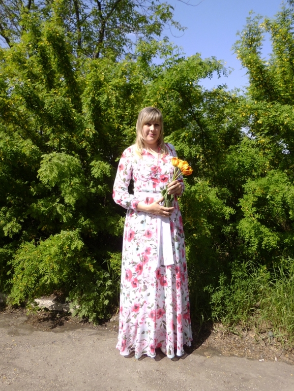 Шитье одежды, выкройки, ремонт одежды, шторы, швейные машины (уже приобретенные)Наконец-то сшила хоть что-то для себя))) У Леры был выпускной из 4 класса, идти было абсолютно не в чем((( Пришлось шить себе платье. Ушло шифона с цветами 5 метров и белого на подклад 4 м. Юбка 3/4 солнца, подклад не много короче.Можно было бы вырезсделать поглубже,но не хотелось распускать и перешивать.Рукав 3/4 на манжетах. Наверное впервые я довольна своим результатом для себя)))