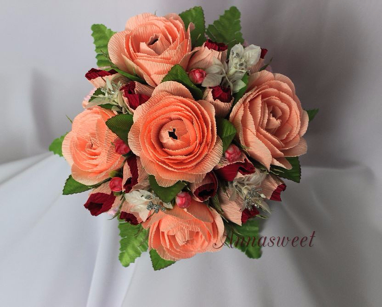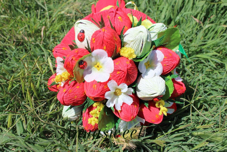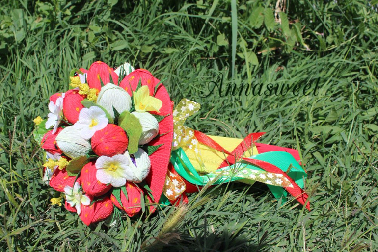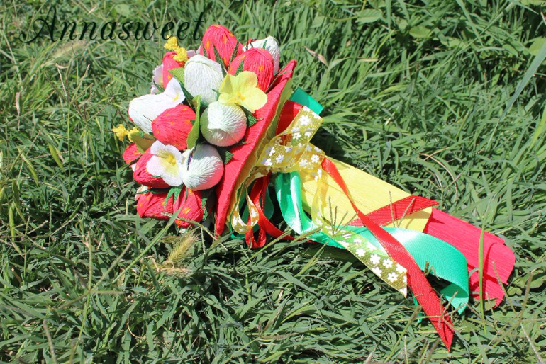 За два с лишним месяца сделала только два букетика, лень одолевает))) Один делала просто так, "авось кто закажет", а второй сегодня ночью вояла на день рождения одноклассницы сына.