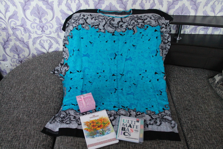 Подарочки для меня. Очень нежное, легкое, домашнее платье. Как же в нем легко, свободно и не жарко (балдею от легкости платья). Фото расцветки не передает. Сочное, ярко бирюзовое. Блокнотики всегда мне нужны. Косметика в коробочке.