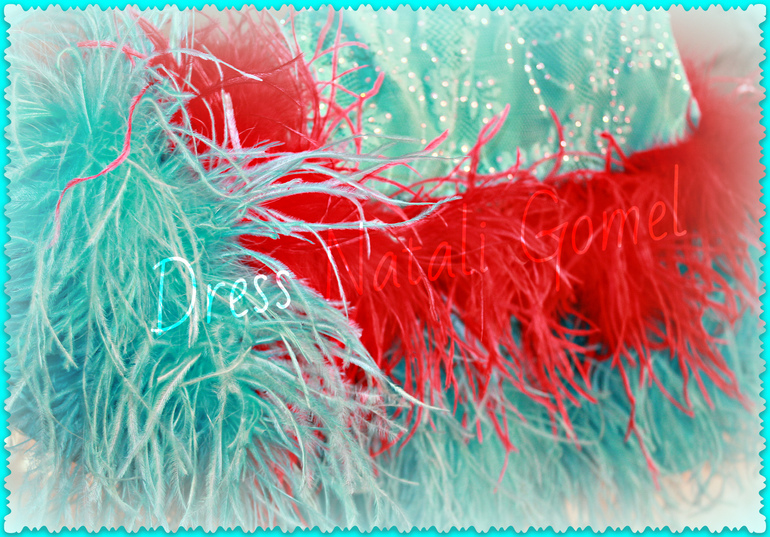 Бифлекс, кружево, около 300 пришивных страз, около 1500 клеевых, боа из перьев страуса.