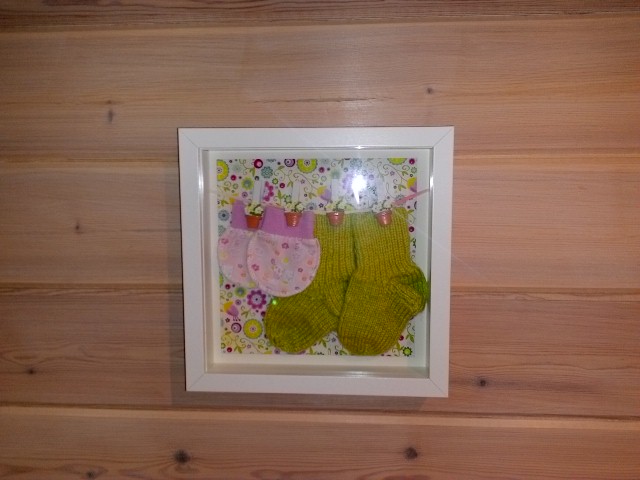 Серия "Мамины сокровища". Все очень просто. Рамка Икеа, фоновый милый рисунок, на веревочке на декоративных прищепках первые рукавички-царапки и носочки. Можно повесить что угодно: бирочки из роддома, пустышку и т.д.