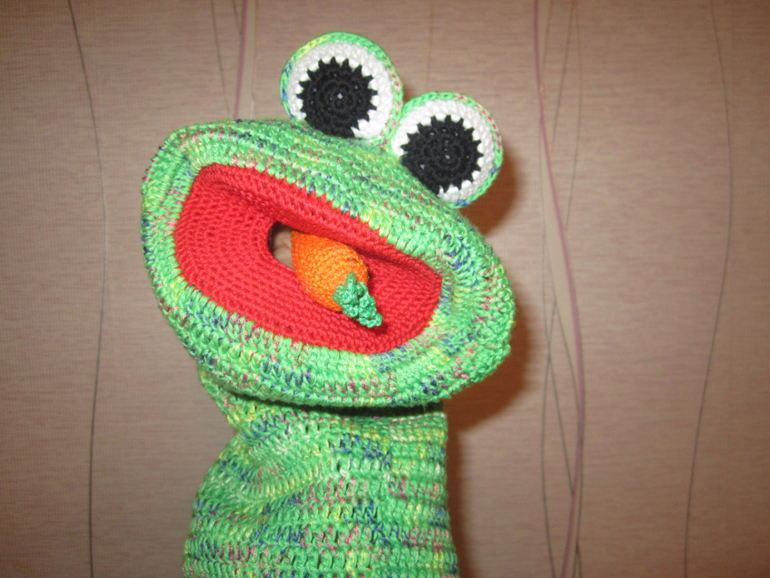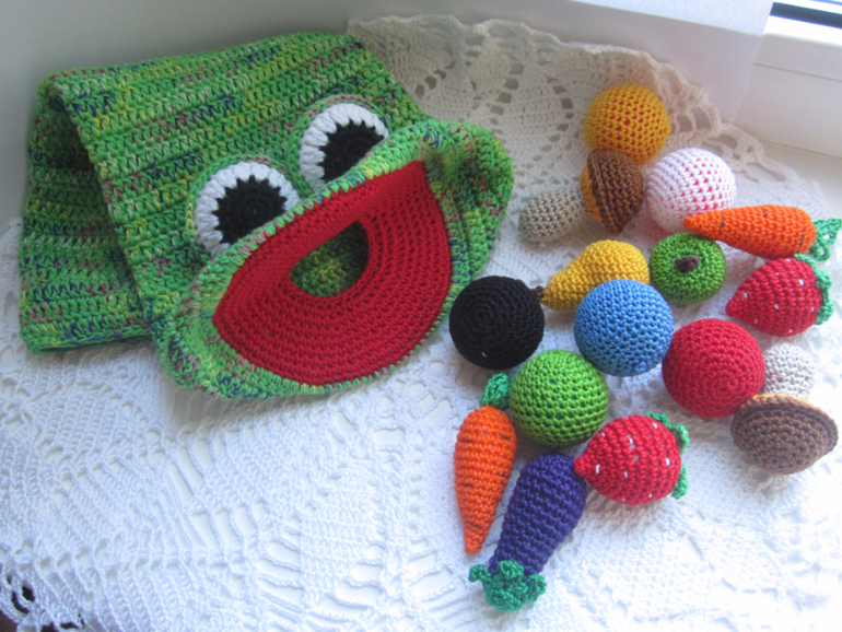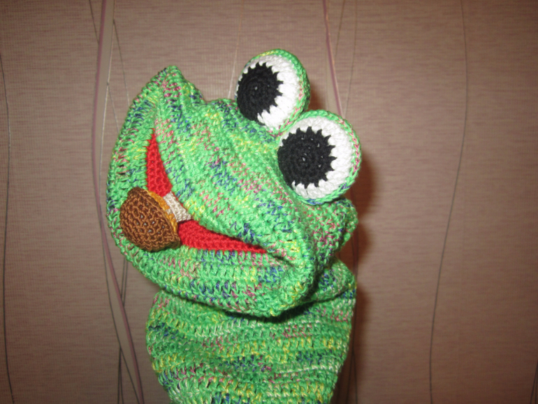 а рот вяжу так: сначала цепочку, по диаметру пластиковой основы, дырки в середине, а потом прибавляю, всегда на глаз. Таких 2 детали, связываю их, а внутрь пластиковую основу (обычно это крышка от сметаны, прозрачная которая)