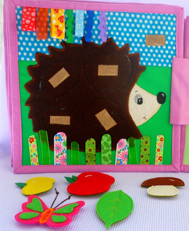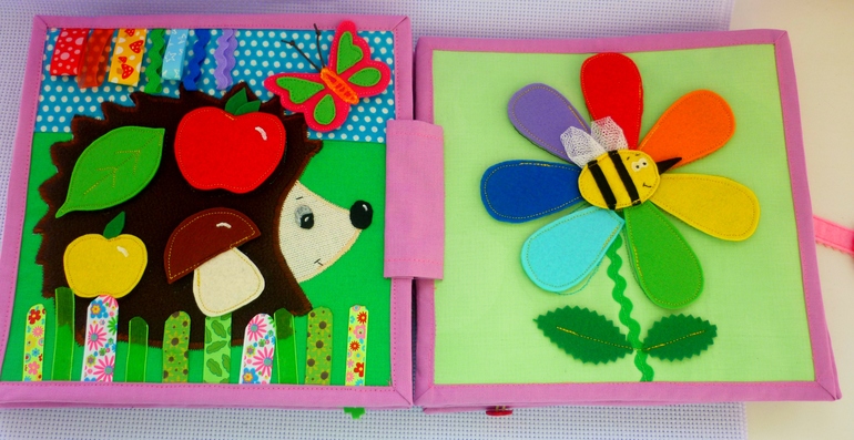 3. Ежик. Раскладываем предметы по контуру. Сравниваем яблоки-большой маленький, теребим ленточки. Цветок. Раскладываем лепестки в соответствии с цветом, учим цвета. БАбочки и пчелка могут меняться местами. Крылья пчелки из сетки для дополнительных тактильных ощущений.