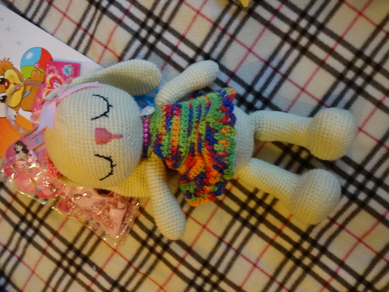 Xenia обменялись подарочками по повду дня рождения наших принцесс :) И вот накануне Олиного праздника Ксюша нас порадовала от всей души!!! Начну с рукодельного : прекрасная зайка, связанная Ксюшей, милая и теплая, наполненная любовью :) Она просто великолепна! Такая милая сплюшка, сама бы с ней спала - но нет, место уже занято Олей :)