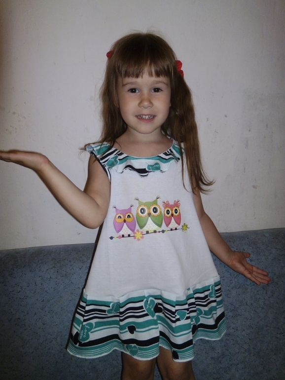 Шитье одежды, выкройки, ремонт одежды, шторы, швейные машины (уже приобретенные)Решила вчера начать утилизировать остатки тканей. Пока вышло 2 наряда для Алисы. Дошила уже перед сном, Алиса очень довольная бегала, все меряла. Очень любит обновочки и еще фотографироваться))) Платье из кулирки ,выкройка Отто 3/2013 мод.12,термотрансфер.Рост 104.