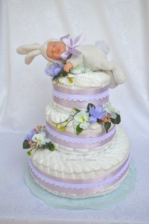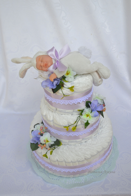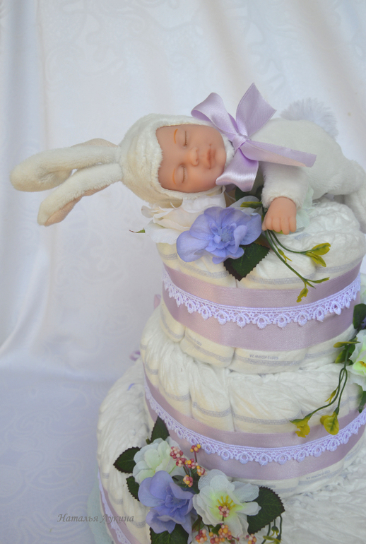 Подарки, игрушки, погремушки для новорожденных.Всем привет! Решила показать еще один тортик из памперсов с коллекционной куколкой "Зайка". Тортик универсальный, подойдет как для девочки, так и для мальчика.